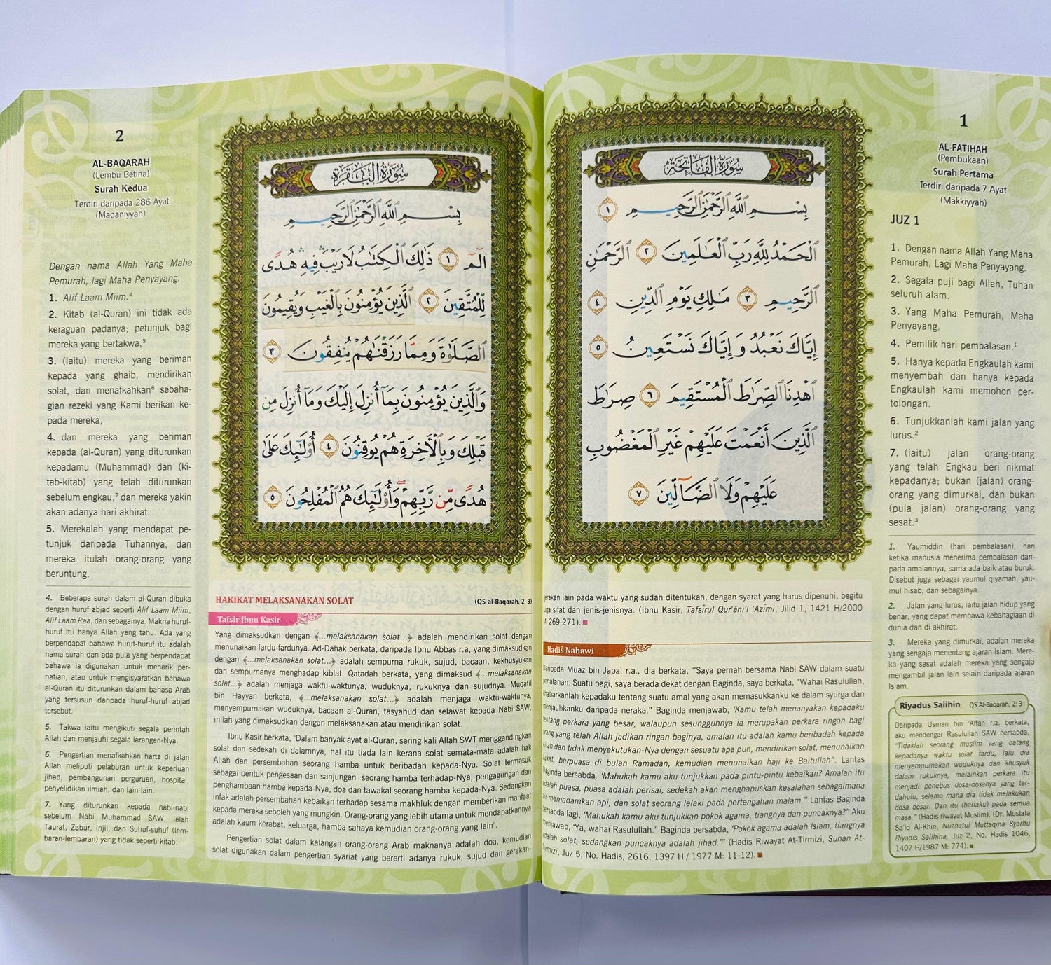 This beautifully presented Al-Quran Al-Karim in B5 medium size features both Malay/Indonesian translation and colour-coded Tajwid rules, making it an excellent choice for learners and fluent readers alike.