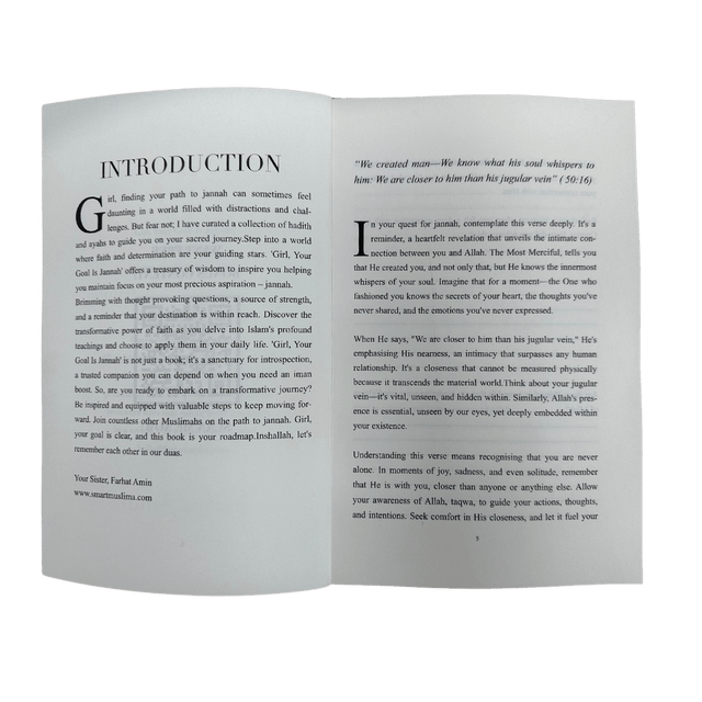 Girl, Your Goal Is Jannah is an inspirational Islamic guide written for Muslim girls and women who seek to strengthen their faith, purpose, and direction in life. Packed with wisdom from the Qur’an and Sunnah, the book encourages readers to focus on their ultimate goal — attaining Jannah (Paradise) — while navigating modern challenges and distractions.