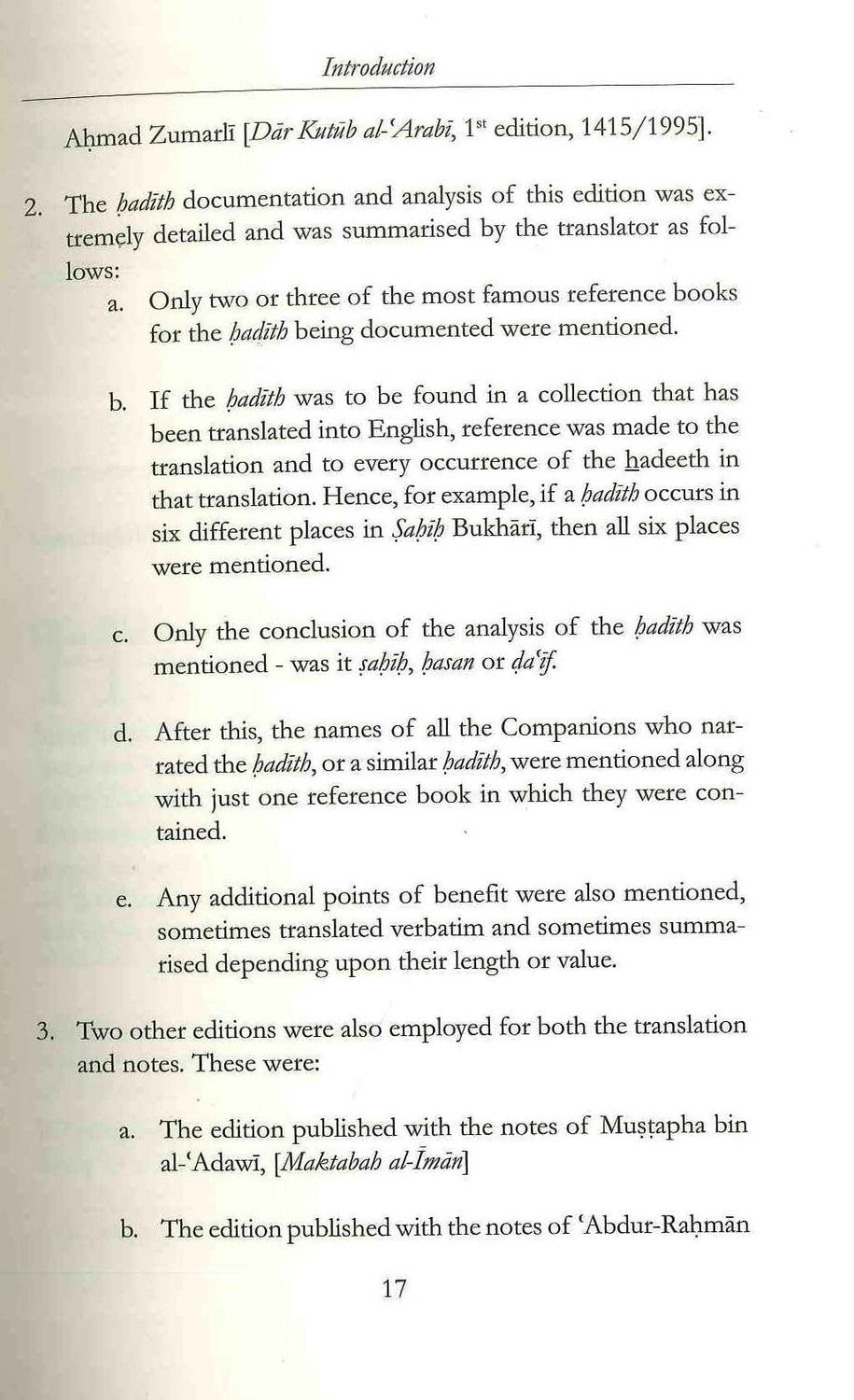 Introduction Ahmad Zumarli [Där Kutub al-'Arabi, 1st edition, 1415/1995]. 2. The hadith documentation and analysis of this edition was ex- tremely detailed and was summarised by the translator as fol- lows: a. Only two or three of the most famous reference books for the hadith being documented were mentioned. b. If the hadith was to be found in a collection that has been translated into English, reference was made to the translation and to every occurrence of the hadeeth in that translation. Hence, for example, if a hadith occurs in six different places in Sahih Bukhari, then all six places were mentioned. c. Only the conclusion of the analysis of the hadith was mentioned - was it sabiḥ, hasan or da'if. d. After this, the names of all the Companions who nar- rated the hadith, or a similar hadith, were mentioned along with just one reference book in which they were con- tained. e. Any additional points of benefit were also mentioned, sometimes translated verbatim and sometimes summa- rised depending upon their length or value. 3. Two other editions were also employed for both the translation and notes. These were: a. The edition published with the notes of Mustapha bin al-'Adawi, [Maktabah al-Iman] b. The edition published with the notes of 'Abdur-Rahman 17