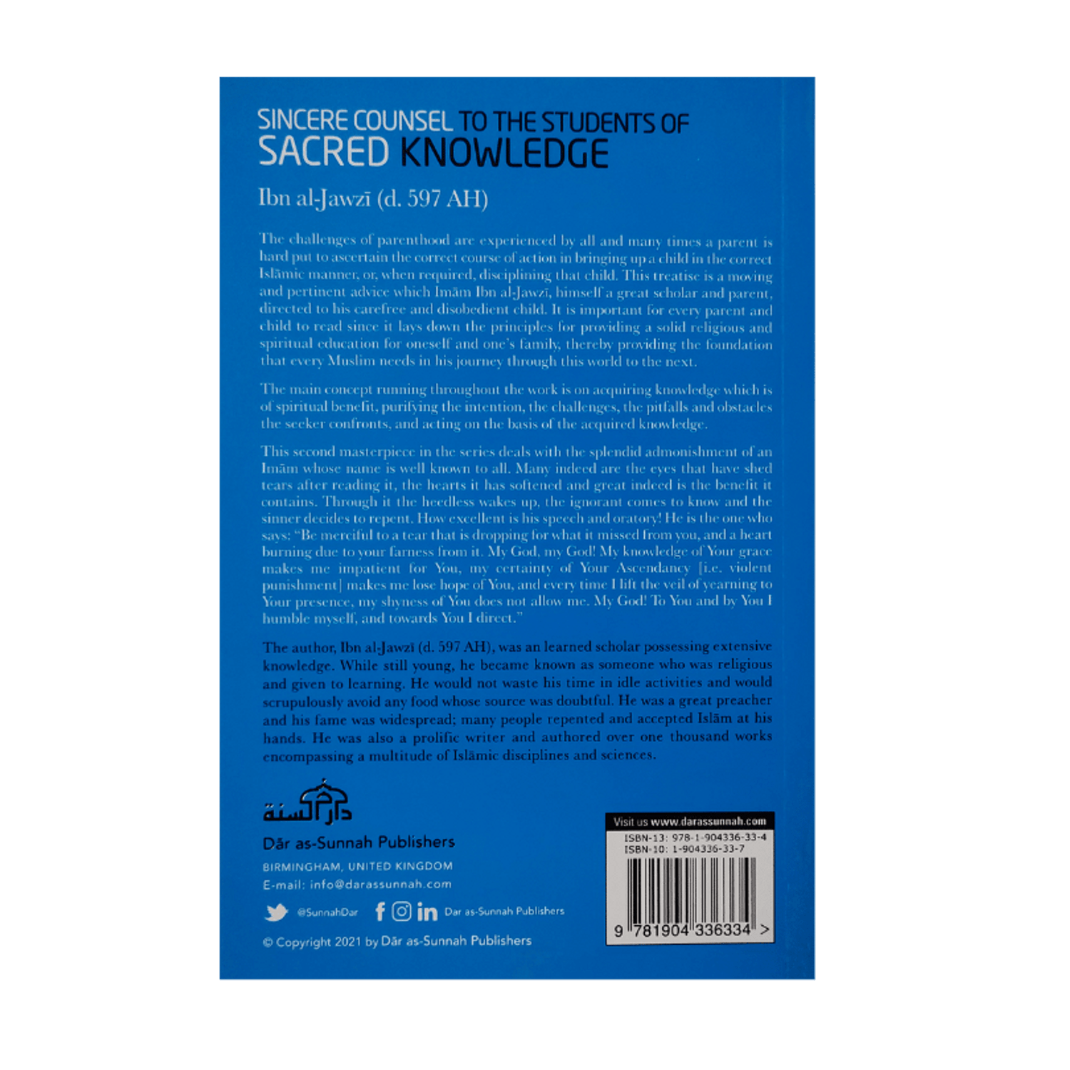 Sincere Counsel To The Students of Sacred Knowledge By : Ibn al-Jawzi (D.597 AH) '' Sincere Counsel to the Students of Sacred Knowledge '' by Shaikh ibn al-Jawzi The challenges of parenthood are experienced by all and many times a parent is hard put to ascertain the correct course of action in bringing up a child in the correct Islamic manner or when required, disciplining that child.