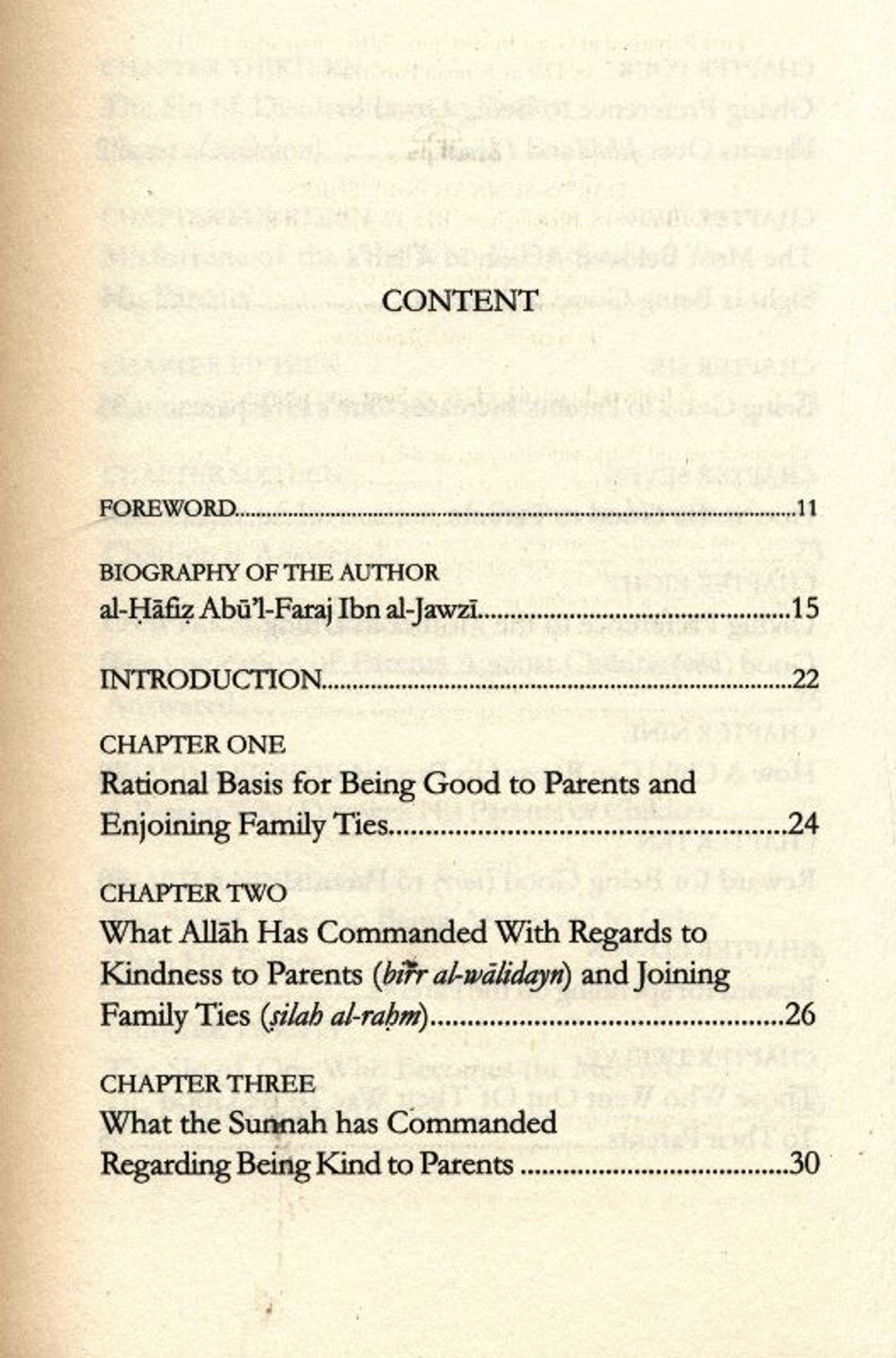 CONTENT FOREWORD... BIOGRAPHY OF THE AUTHOR al-Hafiz Abu'l-Faraj Ibn al-Jawzi...... INTRODUCTION... CHAPTER ONE Rational Basis for Being Good to Parents and Enjoining Family Ties... CHAPTER TWO ..11. .15 .22 ............24 What Allah Has Commanded With Regards to Kindness to Parents (birr al-wälidayn) and Joining Family Ties (silah al-raḥm).... CHAPTER THREE What the Sunnah has Commanded Regarding Being Kind to Parents ...26 ..30