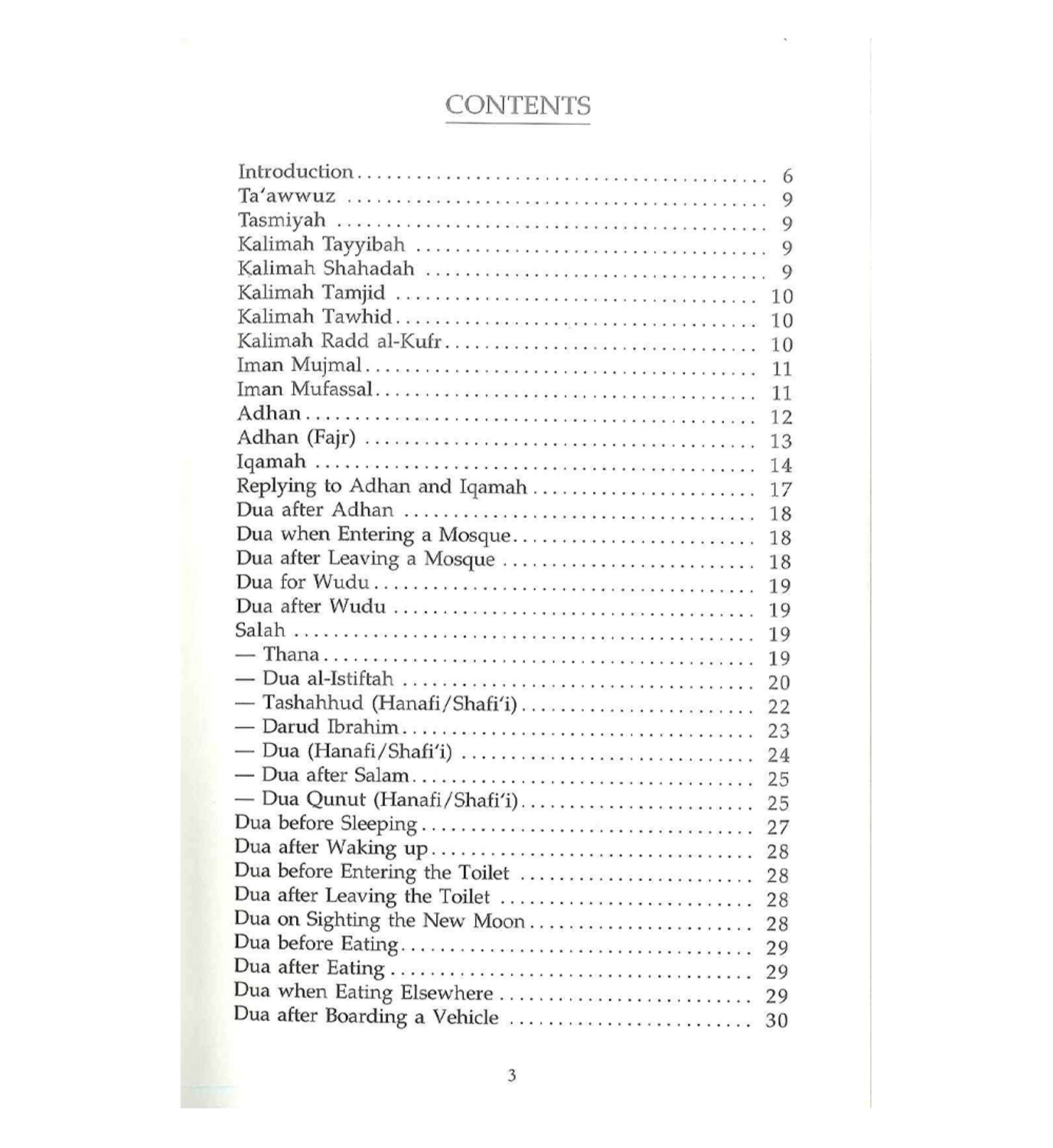 - About 82 Important Readings - From Ta-aw-wuth - Kalimah / Basic Tetaments of Belief - Adhaan - Duas for Salaat (Prayers During Salah) - Daily Dua's - Janazah (Funeral Prayer) and Other Duas - Clearly presented and Easy to read - Recommended for Primary Madrassahs and New Muslims to Read Arabic Properly This book contains masnun duas or the duas which were taught by the Prophet Muhammad S.A.W.W. Dua is a noble form of dhikr or remembrance of Allah. By learning these daus and recitng them at the appropriate occasions, our every action is turned into ibadah. Our sleeping, eating, drinking, dressing, etc, all assume the form of ibadah. Constant and conscious recital of the various duas at their appropriate time fixes the remembrance of ALLAH in the hearts. These duas of the Prophet draw the faithful closer to his Creator. Therefore, it is of absolute necessity that all Muslims learn and recite the various duas. Felicity and success will be the result, insha Allah.