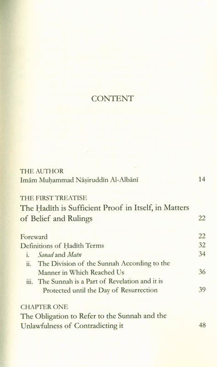 THE AUTHOR CONTENT Imam Muḥammad Nasiruddin Al-Albāni THE FIRST TREATISE The Hadith is Sufficient Proof in Itself, in Matters of Belief and Rulings Foreward 14 Definitions of Hadith Terms i. Sanad and Matn ii. The Division of the Sunnah According to the Manner in Which Reached Us iii. The Sunnah is a Part of Revelation and it is Protected until the Day of Resurrection CHAPTER ONE The Obligation to Refer to the Sunnah and the Unlawfulness of Contradicting it 22 22 2225 32 34 36 36 39 48