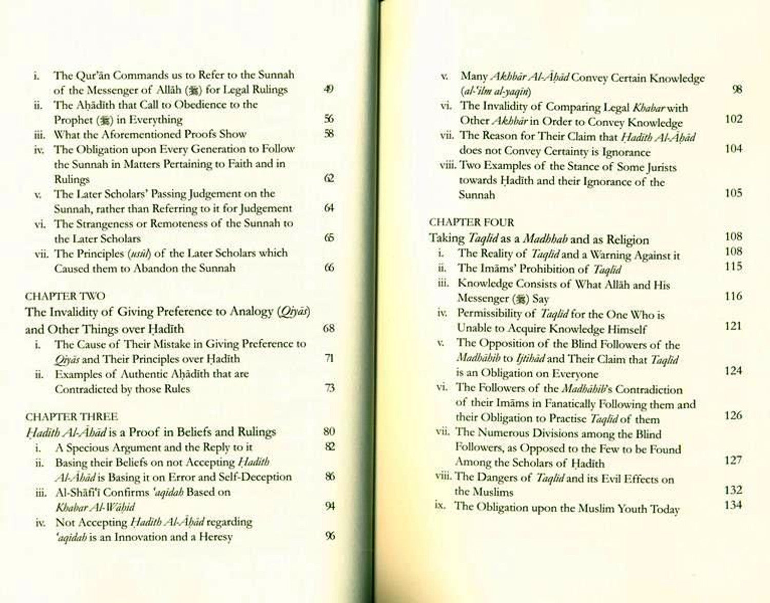 î. The Qur'an Commands us to Refer to the Sunnah of the Messenger of Allah () for Legal Rulings ii. The Ahadith that Call to Obedience to the 49 p 888 56 58 iv. The Obligation upon Every Generation to Follow Prophet () in Everything iii. What the Aforementioned Proofs Show the Sunnah in Matters Pertaining to Faith and in Rulings v. The Later Scholars' Passing Judgement on the Sunnah, rather than Referring to it for Judgement vi. The Strangeness or Remoteness of the Sunnah to the Later Scholars vii. The Principles (usi) of the Later Scholars which Caused them to Abandon the Sunnah 62 64 2 3 9 9 CHAPTER TWO The Invalidity of Giving Preference to Analogy (Qiyas) and Other Things over Hadith 68 i. The Cause of Their Mistake in Giving Preference to Qiyas and Their Principles over Hadith 71 ii. Examples of Authentic Ahadith that are Contradicted by those Rules 73 CHAPTER THREE Hadith Al-Abad is a Proof in Beliefs and Rulings i. A Specious Argument and the Reply to it ii. Basing their Beliefs on not Accepting Hadith Al-Abad is Basing it on Error and Self-Deception iii. Al-Shafi'i Confirms 'aqidab Based on Khabar Al-Wabid iv. Not Accepting Hadith Al-Abad regarding aqidah is an Innovation and a Heresy 94 96 88888 80 82 86 v. Many Akhbar Al-Abad Convey Certain Knowledge (al-ilm al-yagin) vi. The Invalidity of Comparing Legal Khabar with Other Akhbar in Order to Convey Knowledge vii. The Reason for Their Claim that Hadith Al-Abad does not Convey Certainty is Ignorance viii. Two Examples of the Stance of Some Jurists towards Hadith and their Ignorance of the Sunnah CHAPTER FOUR 98 102 104 105 Taking Taqlid as a Madhhab and as Religion 108 1. The Reality of Taqlid and a Warning Against it ii. The Imams' Prohibition of Taqlid 108 115 116 121 iii. Knowledge Consists of What Allah and His Messenger () Say iv. Permissibility of Taqlid for the One Who is Unable to Acquire Knowledge Himself v. The Opposition of the Blind Followers of the Madhabib to Ijtihad and Their Claim that Taglid is an Obligation on Everyone vi. The Followers of the Madhabib's Contradiction of their Imams in Fanatically Following them and their Obligation to Practise Taqlid of them vii. The Numerous Divisions among the Blind Followers, as Opposed to the Few to be Found Among the Scholars of Hadith viii. The Dangers of Taqlid and its Evil Effects on the Muslims ix. The Obligation upon the Muslim Youth Today 124 126 127 132 134