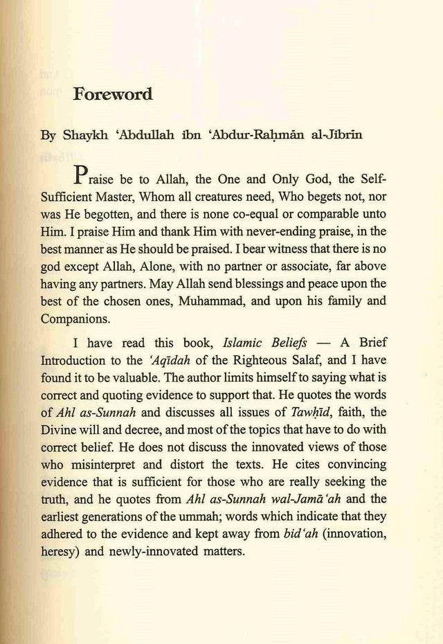 In contrast, this book Islamic Beliefs - A Brief introduction to the Aqeedah (belief, creed) of the Righteous Salaf, is written in a straightforward style, distilling the knowledge of the scholars and making it accessible to the ordinary Muslim. It touches on the main points of 'aqeedah and explains the main features of the path of the Prophet (P.B.U.H) and the early generation, with brief references to the deviant groups in order to show the contrast between the path of the Prophets (P.B.U.H) and the paths of the deviant groups, between light and darkness, guidance and misguidance. The straightforward approach of this book will allow the reader to follow its arguments and develop a clear picture of the proper approach to and interpretation of the Qur'aan and Sunnah.
