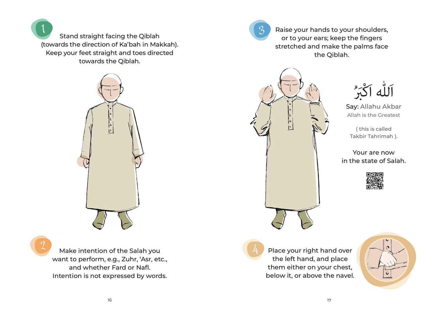 Stand straight facing the Qiblah (towards the direction of Ka'bah in Makkah). Keep your feet straight and toes directed towards the Qiblah. Raise your hands to your shoulders, or to your ears; keep the fingers stretched and make the palms face the Qiblah.