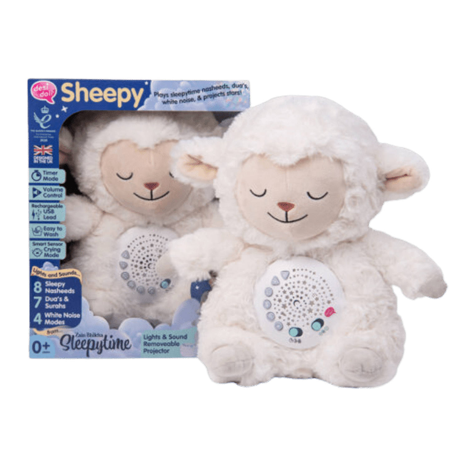 Sheepy the Sleepytime Sheep by Desi Doll Company is a cuddly companion that plays nasheeds, duas, white noise, and projects stars to soothe babies to sleep. It includes a smart cry sensor, timer & volume control, USB recharge, and a removable projector for easy cleaning.